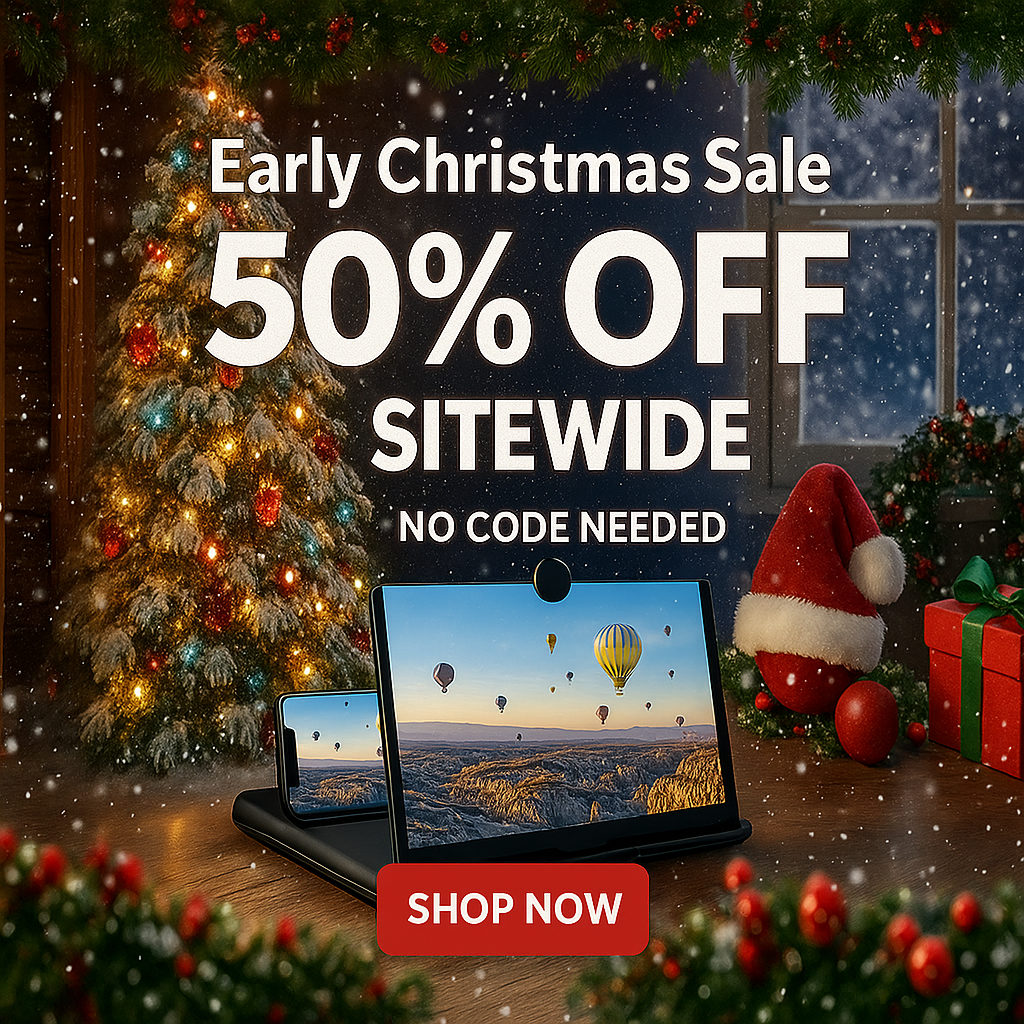Tired of squinting at your tiny phone screen? The 12" Ultra-HD Screen Magnifier instantly transforms your smartphone into a large, crystal-clear display — perfect for watching movies, gaming, or video calls. Whether you’re relaxing at home or traveling, enjoy a 3–4× larger HD view with full eye protection and a festive deal this Christmas season.